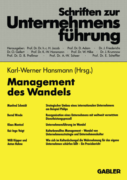 In der Wirtschaftspraxis gibt es keine stationären Zustände. Nachfrage, Wettbewerb, staatliche Rahmenbedingungen und andere für Unternehmensentscheidungen wichtige Einflußfaktoren unterliegen ständigen Veränderungen und konfrontieren die Unternehmen mit der Notwendigkeit einer permanenten Überprüfung und Anpassung ihrer Strukturen und Prozesse. Strategischer Wandel ist längst vom Ausnahme- zum Normalfall geworden: Unternehmensführung kann heutzutage nur noch als Management des Wandels begriffen werden. Der vorliegende Band bietet ein breit gefächertes Spektrum von Konzepten für ein "Management des Wandels". Theoretische Überlegungen werden durch zahlreiche praktische Fall-Beispiele und Erfahrungsberichte ergänzt.