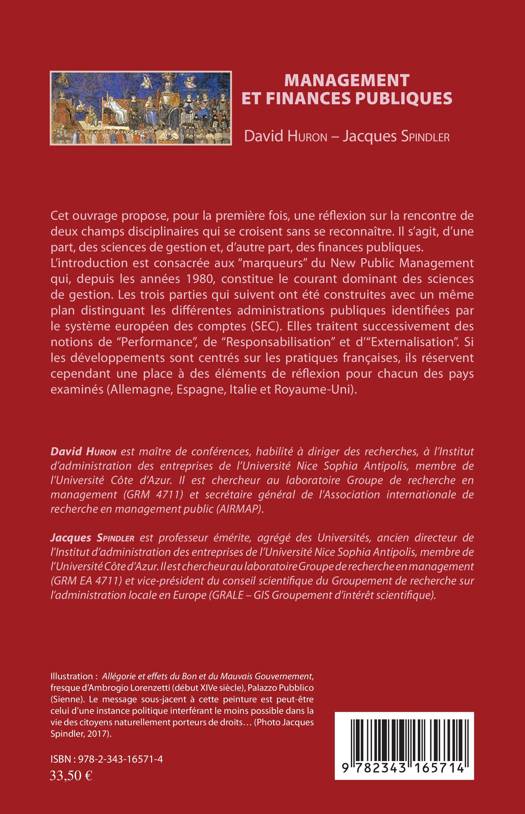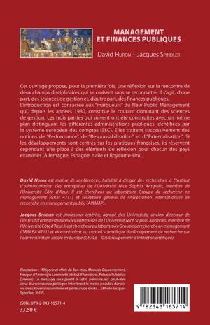 Cet ouvrage propose une réflexion sur la rencontre de deux champs disciplinaires qui se croisent sans se reconnaître. Il s'agit des sciences de gestion et des finances publiques. L'introduction est consacrée aux "marqueurs" du New Public Management qui, depuis les années 1980, constitue le courant dominant des sciences de gestion. Les trois parties qui suivent ont été construites avec un même plan distinguant les différentes administrations publiques identifiées par le système européen des comptes (SEC) : "Performance", "Responsabilisation" et "Externalisation". Si les développements sont centrés sur les pratiques françaises, ils réservent cependant une place à des éléments de réflexion pour chacun des pays examinés (Allemagne, Espagne, Italie et Royaume-Uni).