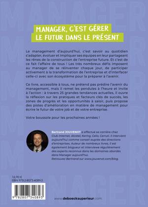 Ce livre, accessible à tous, ne prétend pas prédire l’avenir du management, mais il remet les pendules à l’heure et invite à l’action : à travers 25 grandes tendances actuelles, il ouvre la réflexion sur les pratiques et facteurs clés de succès, les zones de progrès et les opportunités à saisir, puis propose des pistes d’amélioration en matière de management pour écrire le futur de votre job et de votre entreprise.