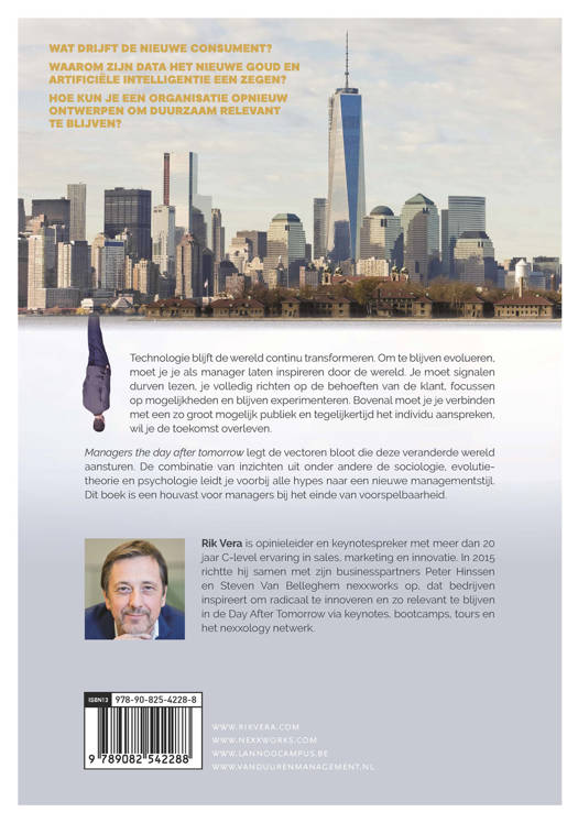 WAT DRIJFT DE NIEUWE CONSUMENT? WAAROM ZIJN DATA HET NIEUWE GOUD EN ARTIFICIËLE INTELLIGENTIE EEN ZEGEN? HOE KUN JE EEN ORGANISATIE OPNIEUW ONTWERPEN OM DUURZAAM RELEVANT TE BLIJVEN? Technologie blijft de wereld continu transformeren. Om te blijven evolueren, moet je je als manager laten inspireren door de wereld. Je moet signalen durven lezen, je volledig richten op de behoeften van de klant, focussen op mogelijkheden en blijven experimenteren. Bovenal moet je je verbinden met een zo groot mogelijk publiek en tegelijkertijd het individu aanspreken, wil je de toekomst overleven. Managers the day after tomorrow legt de vectoren bloot die deze veranderde wereld aansturen. De combinatie van inzichten uit onder andere de sociologie, evolutietheorie en psychologie leidt je voorbij alle hypes naar een nieuwe managementstijl. Dit boek is een houvast voor managers bij het einde van voorspelbaarheid.