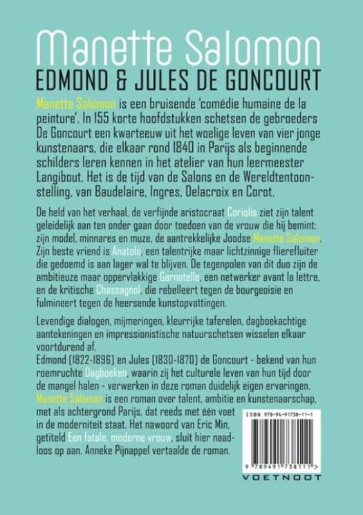In hun fameuze dagboeken deden EDMOND [1822-1896] en JULES [1830-1870] DE GONCOURT op levendige wijze verslag van het culturele en literaire leven in Parijs in de tweede helft van de 19e eeuw. Minder bekend is dat de broers ook veel over kunst hebben gepubliceerd en een aantal romans hebben geschreven: in 1867 verscheen MANETTE SALOMON, een roman over kunst, hartstocht en onvermogen. Deze roman kan gezien worden als een kroniek van het Parijse kunstenaarsleven in de periode 1840-1865. Rond 1840 leren vier jongemannen elkaar kennen in het prestigieuze atelier van de historieschilder Langibout. In 155 korte hoofdstukken leeft en lijdt de lezer met ze mee, is getuige van hun wederwaardigheden, hun successen, hun mislukkingen, hun fortuin, hun miserie. De roman beslaat een periode van 25 jaar, waarin de levens van de vier soms parallel lopen, ze elkaar uit het oog verliezen en ook weer tegen het lijf lopen. De naamgeefster van het boek, schildersmodel Manette Salomon, doet halverwege de roman haar intrede. Hoofdfiguur is de gedreven schilder Coriolis, een aristocratische estheet. Wanhopig op zoek naar een geschikt model voor een stagnerend werk ontwaart hij Manette Salomon in een omnibus. Deze eigengereide jonge vrouw wordt zijn model, zijn muze, zijn minnares, zijn vrouw en de moeder van zijn zoon. Maar langzaam maar zeker neemt Manette de regie over Coriolis' leven over: zij bepaalt waar, wat en hoe hij moet schilderen, ze vervreemdt hem van zijn vrienden en doodt uiteindelijk zijn talent en zijn creativiteit. Anatole, een talentvolle flierefluiter en altijd in geldnood, is Coriolis' vriend. Na een periode vol miserie trekt hij in bij Coriolis en wordt dikke vrienden met diens aapje Vermillon. De middelmatige maar ambitieuze Garnotelle, een intrigant en netwerker avant la lettre, weet tot de hogere kringen door te dringen en vele opdrachten te versieren; hij wordt een rijk man met aanzien, wiens pad geregeld dat van de anderen kruist. Nummer vier is de eeuwige rebel Chassagnol, die tekeer gaat tegen alles wat 'bourgeoisie' en 'officieel' is; hij discussieert veel en graag over kunst en kunstenaars. In zijn boeiende nawoord gaat de Belgische filosoof en kunstcriticus ERIC MIN in op het gemiste rendez-vous van de Goncourts met Félicien Rops en Manette Salomon als de incarnatie van de moderne vrouw bij Baudelaire en Rops. Anneke Pijnappel vertaalde de roman.