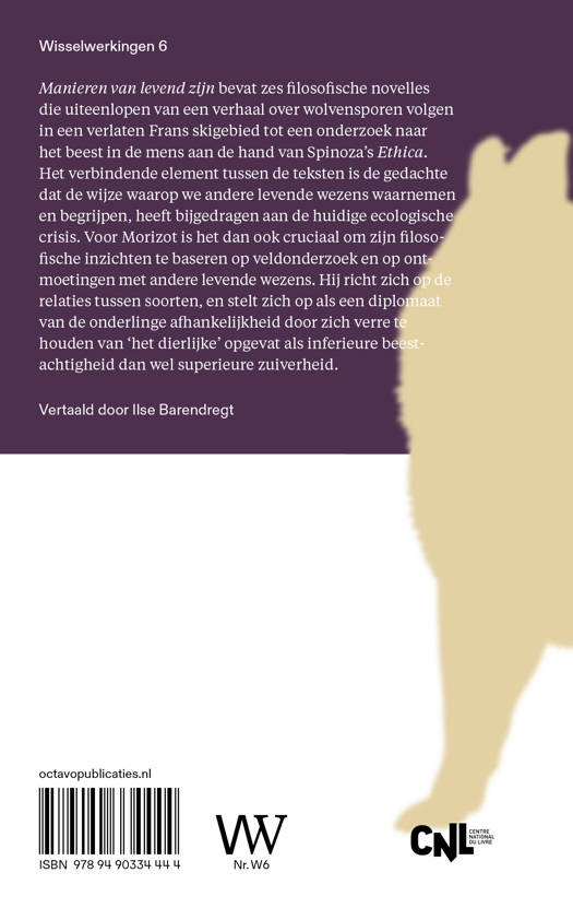 Manieren van levend zijn bevat zes filosofische novelles die uiteenlopen van een verhaal over wolvensporen volgen in een verlaten Frans skigebied tot een onderzoek naar het beest in de mens aan de hand van Spinoza's Ethica. Het verbindende element tussen de teksten is de gedachte dat de wijze waarop we andere levende wezens waarnemen en begrijpen, heeft bijgedragen aan de huidige ecologische crisis. Voor Morizot is het dan ook cruciaal om zijn filosofische inzichten te baseren op veldonderzoek en op ontmoetingen met andere levende wezens. Hij richt zich op de relaties tussen soorten, en stelt zich op als een diplomaat van de onderlinge afhankelijkheid door zich verre te houden van ‘het dierlijke’ opgevat als inferieure beestachtigheid dan wel superieure zuiverheid.