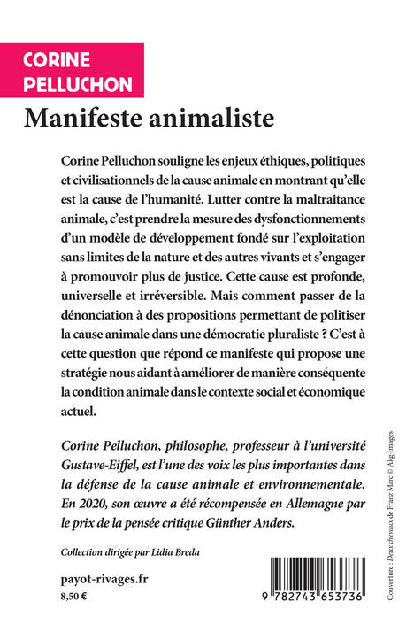 Corine Pelluchon souligne les enjeux éthiques, politiques et civilisationnels de la cause animale en montrant qu'elle est la cause de l'humanité. Lutter contre la maltraitance animale, c'est prendre la mesure des dysfonctionnements d'un modèle de développement fondé sur l'exploitation sans limites de la nature et des autres vivants et s'engager à promouvoir plus de justice. Cette cause est profonde, universelle et irréversible. Mais comment passer de la dénonciation à des propositions permettant de politiser la cause animale dans une démocratie pluraliste ? C'est à cette question que répond ce manifeste qui propose une stratégie nous aidant à améliorer de manière conséquente la condition animale dans le contexte social et économique actuel.