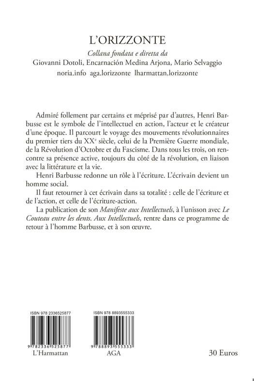 On est face à un personnage unique, qui a eu un grand rôle, l’une des voix communistes les plus importantes et les plus engagées, pour les travailleurs, pour la liberté, contre le fascisme, contre la guerre, dont il prophétise le danger imminent. Le Manifeste aux Intellectuels assume ainsi une grande valeur de témoignage et de programmation. Barbusse y parle pour l’avenir, sur la lignée de la fraternité. Il cherche un lecteur universel, de son temps et des temps à venir. L’auteur du Feu est à relire, dans sa vérité historique. Barbusse fait la guerre à la guerre. Il demande une littérature sociale. Il a confiance dans la parole de l’écrivain. Porte-parole d’une génération, il est d’une sincérité cristalline. Il met toujours l’autre au premier plan, le pauvre, l’écarté, l’oublié, le maudit. Nous découvrons un lutteur infatigable, un être cohérant, un représentant crucial de son temps, et un peu du nôtre. Admiré follement par certains et méprisé par d’autres, Henri Barbusse est le symbole de l’intellectuel en action, l’acteur et le créateur d’une époque. Il parcourt le voyage des mouvements révolutionnaires du premier tiers du XXe siècle, celui de la Première Guerre mondiale, de la Révolution d’Octobre et du Fascisme. Dans tous les trois, on rencontre sa présence active, toujours du côté de la révolution, en liaison avec la littérature et la vie. Henri Barbusse redonne un rôle à l’écriture. L’écrivain devient un homme social. Il faut retourner à cet écrivain dans sa totalité : celle de l’écriture et de l’action, et celle de l’écriture-action. La publication de son Manifeste aux Intellectuels, à l’unisson avec Le couteau entre les dents. Aux Intellectuels, rentre dans ce programme de retour à l’homme Barbusse, et à son œuvre.