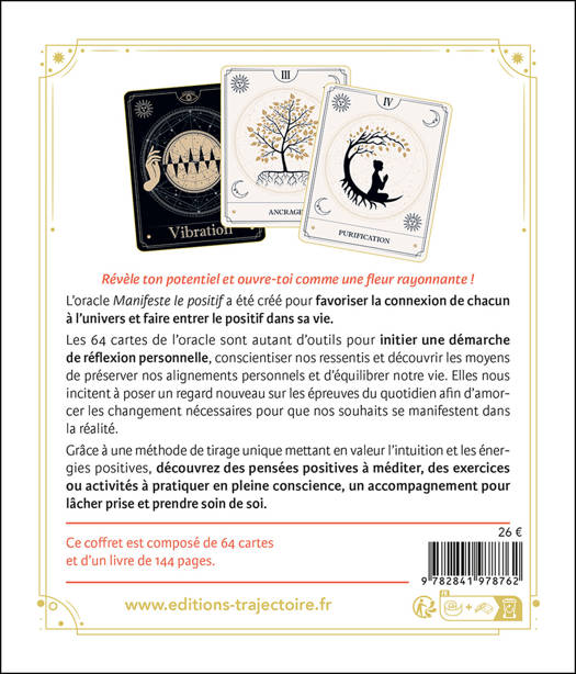 L'oracle « Manifeste le positif » a été créé pour favoriser la connexion de chacun à l'univers et faire entrer le positif dans sa vie. Les 64 cartes de l'oracle sont autant d'outils pour initier une démarche de réflexion personnelle, conscientiser nos ressentis et découvrir les moyens de préserver nos alignements personnels et d'équilibrer notre vie. Elles nous incitent à poser un regard nouveau sur les épreuves du quotidien afin d'amorcer les changements nécessaires pour que nos souhaits se manifestent dans la réalité. Grâce à une méthode de tirage unique mettant en valeur l'intuition et les énergies positives, découvrez des pensées positives à méditer, des exercices ou activités à pratiquer en pleine conscience, un accompagnement pour lâcher prise et prendre soin de soi.