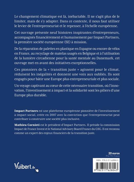 Le changement climatique est là, inéluctable. Il ne s’agit plus de le limiter, mais de s’y adapter. Dans ce contexte, il nous faut utiliser le levier de l’entrepreneuriat et le repenser, à l’échelle européenne. Cet ouvrage présente neuf histoires inspirantes d’entrepreneurs, accompagnés financièrement et humainement par Impact Partners, la première société européenne (SE) à mission. De la réparation de palettes en plastique en Espagne ou encore de vélos en France, au recyclage de matelas usagés en Belgique et à l’utilisation