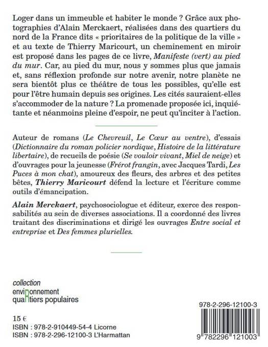 Loger dans un immeuble et habiter le monde ? Grâce aux photographies d'Alain Merckaert, réalisées dans des quartiers du nord de la France dits « prioritaires de la politique de la ville » et au texte de Thierry Maricourt, un cheminement en miroir est proposé dans les pages de ce livre, Manifeste (vert) au pied du mur. Car, au pied du mur, nous y sommes plus que jamais et, sans réflexion profonde sur notre avenir, notre planète ne sera bientôt plus ce théâtre de tous les possibles, qu'elle est pour l'être humain depuis ses origines. Les cités sauraient-elles s'accommoder de la nature ? La promenade proposée ici, inquiétante et néanmoins pleine d'espoir, ne peut qu'inciter à l'action.