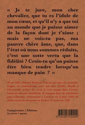 Le chevalier des Grieux rencontre Manon Lescaut par hasard et sait dès la première seconde qu'il est amoureux d'elle. Cette dernière doit bientôt rentrer dans un couvent tandis que Des Grieux, lui, doit devenir sous peu chevalier de l'ordre de Malte. Il n'en sera rien, le chevalier décide de s'enfuir avec Manon, en dépit des protestations de son entourage - son père et son fidèle ami Tiberge - pour vivre leur passion outrageuse riche en rebondissements. Le livre fut jugé si scandaleux lors de sa publication qu'il fut saisi et condamné à être brûlé à deux reprises, en 1733 et 1735. D'une grande subtilité psychologique et restituant finement l'époque où il a été écrit, ce roman n'a rien perdu de sa beauté ténébreuse.''