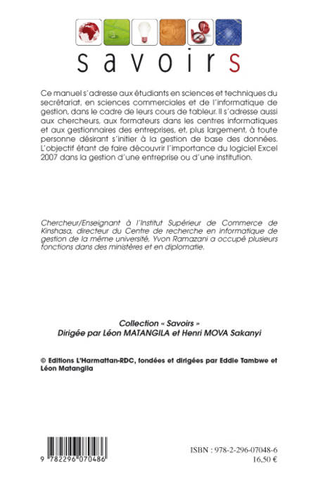 L'objectif de cet ouvrage est de faire découvrir l'importance du logiciel Excel 2007 dans la gestion d'une entreprise ou d'une institution. Ce manuel s'adresse aux étudiants en sciences et techniques du secrétariat, en sciences commerciales et de l'informatique de gestion, ainsi qu'aux chercheurs et formateurs.