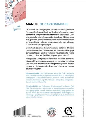 Ce manuel de cartographie, tout en couleurs, présente l’ensemble des outils et méthodes nécessaires pour concevoir, comprendre et interpréter des cartes. Dans une approche plus critique, cette deuxième édition, revue et augmentée, propose des méthodes innovantes et détaille les procédés de « mise en scène » pour aller plus loin dans la conception cartographique. Quels fonds de cartes choisir ? Comment traiter les différents types de données ? Comment les traduire en langage cartographique ? Quelles variables visuelles (taille, forme, texture, couleur, etc.) utiliser, et pour quels effets ? Avec plus de 160 figures, de nombreux encadrés, définitions et compléments pédagogiques, cet ouvrage constitue une véritable initiation à la cartographie, perçue à la fois comme art de représenter le monde et arme de combat pour le décrypter.