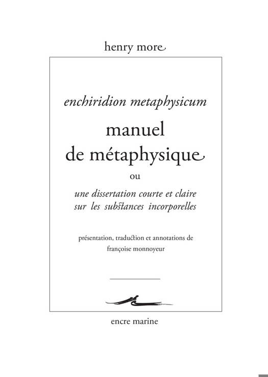 Henry More est le plus connu des Platoniciens de Cambridge et l'Enchiridion Metaphysicum, son dernier ouvrage, reprsente l'accomplissement de sa pense. Il s'agit d'une enqute mtaphysique dont le principal objectif est d'tablir l'existence d'une substance immatrielle, d'une me du monde, sorte d'intermdiaire entre Dieu et le monde par laquelle les choses agissent. More nous invite ainsi dcouvrir la vraie mtaphysique qui consiste en la dcouverte de la nature vritable de l'tendue des tres spirituels comme Dieu, les anges et les dmons, l'espace, les mes individuelles des hommes ou des btes. Ce manuel de mtaphysique prend appui sur le mcanisme cartsien pour mieux le contredire et dmontre que l'extension spirituelle est la principale qualit des esprits. Cette doctrine conduira More re-diviniser l'espace pour l'instituer l'instar des kabbalistes de l'cole de Safed, comme lieu de la possibilit de l'existence du monde. More montre ainsi les limites des mcanismes d'Hobbes et de Descartes tout en essayant de composer avec d'autres savants mcanistes tels que Robert Boyle et Robert Hooke. Quelques annes plus tard, Cambridge, Newton, sur les pas d'Henry More, pensera la nature de son espace physique comme un espace de nature divine, comme un Sensorium Dei.