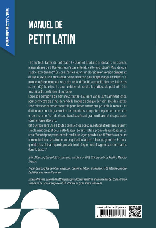 Cet ouvrage sera utile à toutes celles et tous ceux qui étudient le latin ou qui ont simplement du goût pour cette langue. Le petit latin a prouvé depuis longtemps son efficacité pour préparer de la meilleure façon possible les différents concours comportant une version ou une explication latines à leur programme. Et puis, quoi de plus plaisant que de pouvoir lire de façon fluide les grands auteurs latins dans le texte ?