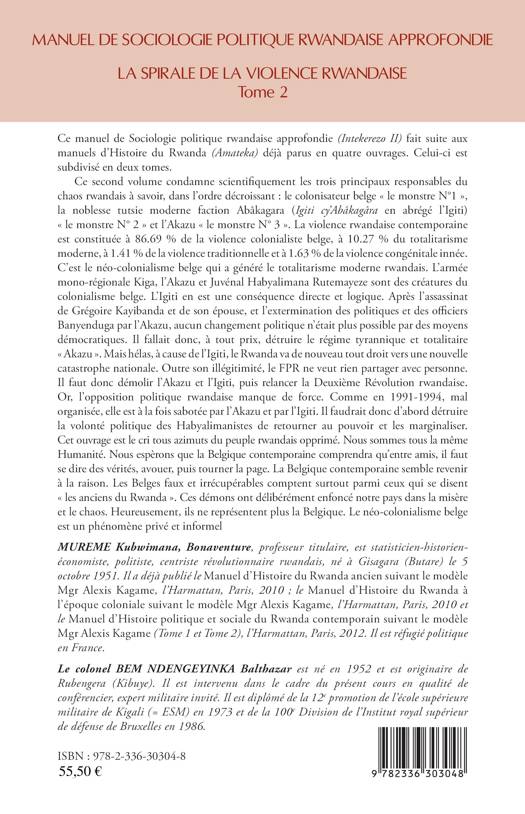 Ce second volume condamne scientifiquement les trois principaux responsables du chaos rwandais à savoir : le colonisateur belge, la noblesse tutsie moderne faction Abâkagara et l'Akazu. La violence rwandaise contemporaine est constituée principalement de la violence colonialiste belge, du totalitarisme moderne, et a minima de la violence traditionnelle. C'est le néo-colonialisme belge qui a généré le totalitarisme moderne rwandais. Mais la Belgique contemporaine semble revenir à la raison...