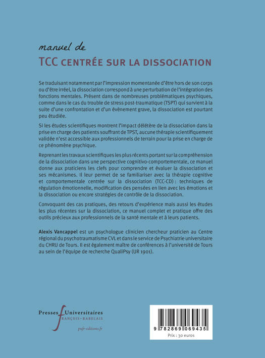 Reprenant les travaux scientifiques les plus récents portant sur la compréhension de la dissociation dans une perspective cognitivo-comportementale, ce manuel donne aux praticiens les clefs pour comprendre et évaluer la dissociation et ses mécanismes. Techniques de régulation émotionnelle, modification des pensées en lien avec les émotions et la dissociation ou encore stratégies de contrôle de la dissociation, il leur permet de se familiariser avec la thérapie cognitive et comportementale centrée sur la dissociation (TCC-CD).