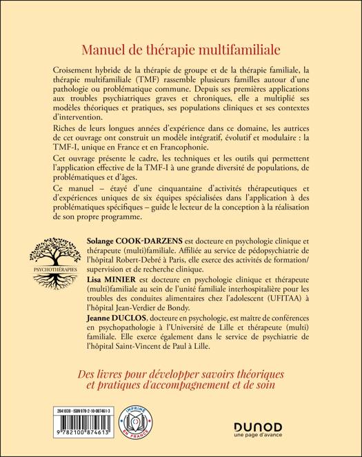 Croisement hybride de la thérapie de groupe et de la thérapie familiale, la thérapie multifamiliale (TMF) rassemble plusieurs familles autour d’une pathologie ou problématique commune. Depuis ses premières applications aux troubles psychiatriques graves et chroniques, elle a multiplié ses modèles théoriques et pratiques, ses populations cliniques et ses contextes d’intervention.