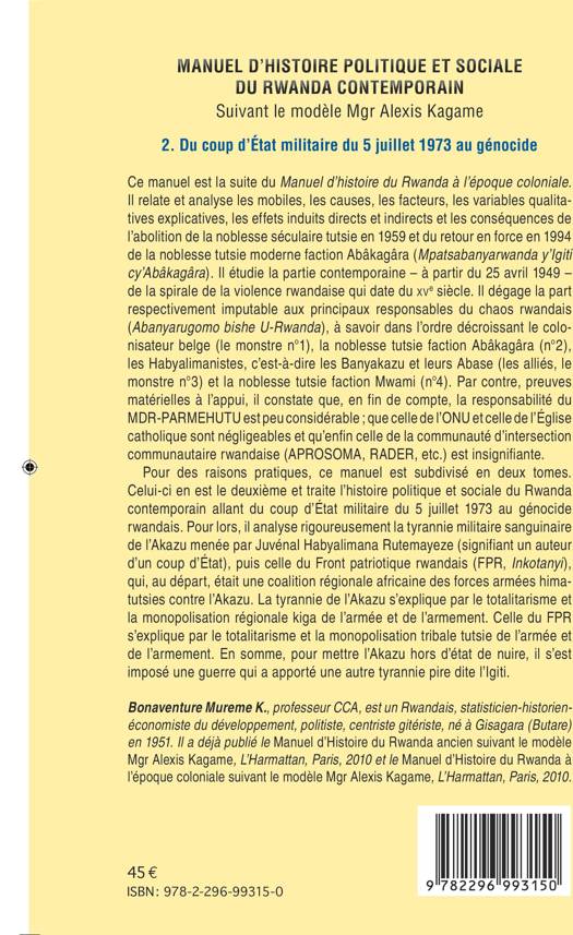 Ce manuel étudie la partie contemporaine, à partir du 25 avril 1949, de la spirale de la violence rwandaise qui date du Ve siècle. Ce tome 2 analyse rigoureusement la tyrannie militaire sanguinaire de l'Akazu menée par Juvénal Habyalimana Rutemayeze, puis celle du Front patriotique rwandais (FPR).