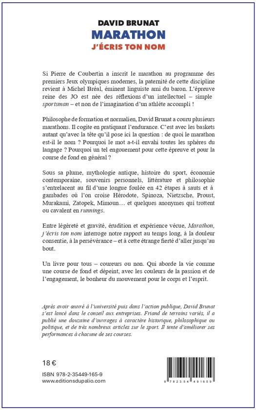 Si Pierre de Coubertin a inscrit le marathon au programme des premiers Jeux olympiques modernes, la paternité de cette discipline revient à Michel Bréal, éminent linguiste ami du baron. L’épreuve reine des JO est née des réflexions d’un intellectuel – simple sportsman – et non de l’imagination d’un athlète accompli !Philosophe de formation et normalien, David Brunat a couru plusieurs marathons. Il cogite en pratiquant l’endurance. C’est avec les baskets autant qu’avec la tête qu’il pose ici la question : de quoi le marathon est-il le nom ? Pourquoi le mot a-t-il envahi toutes les sphères du langage ? Pourquoi un tel engouement pour cette épreuve et pour la course de fond en général ?Sous sa plume, mythologie antique, histoire du sport, économie contemporaine, souvenirs personnels, littérature et philosophie s’entrelacent au fil d’une longue foulée en 42 étapes à sauts et à gambades où l’on croise Hérodote, Spinoza, Nietzsche, Proust, Murakami, Zatopek, Mimoun… et quelques anonymes qui trottent ou cavalent en runnings.Entre légèreté et gravité, érudition et expérience vécue, « Marathon, j’écris ton nom » interroge notre rapport au temps long, à la douleur consentie, à la persévérance – et à cette étrange fierté d’aller jusqu’au bout.Un livre pour tous – coureurs ou non. Qui aborde la vie comme une course de fond et dépeint, avec les couleurs de la passion et de l’engagement, le bonheur du mouvement pour le corps et l’esprit.Après avoir œuvré à l’université puis dans l’action publique, David Brunat s’est lancé dans le conseil aux entreprises. Friand de terrains variés, il a publié une douzaine d’ouvrages à caractère historique, philosophique ou politique, et de très nombreux articles sur le sport. Il tente d’améliorer ses performances à chacune de ses courses.