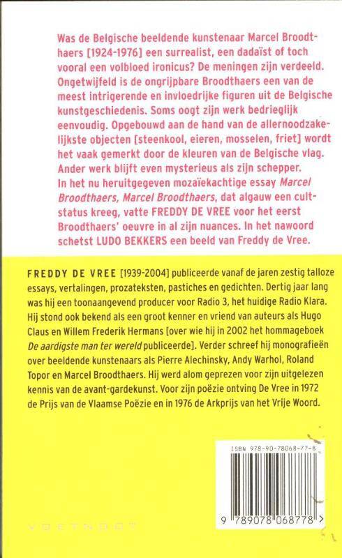 Was de Belgische beeldende kunstenaar MARCEL BROODTHEARS [1924-1976] een surrealist, een dadaïst of toch vooral een volbloed ironicus? De meningen zijn verdeeld. Ongetwijfeld is de ongrijpbare Broodthaers een van de meest intrigerende en invloedrijke figuren uit de vaderlandse kunstgeschiedenis. Soms oogt zijn werk bedrieglijk eenvoudig. Opgebouwd aan de hand van de allernoodzakelijkste objecten [steenkool, eieren, mosselen, friet] wordt het vaak gemerkt door de kleuren van de Belgische vlag. Ander werk blijft dan weer even mysterieus als zijn schepper. In het nu heruitgegeven mozaïekachtige essay Marcel Broodthaers, Marcel Broodthaers, dat algauw een cultstatus kreeg, vatte Freddy de Vree voor het eerst Broodthaers oeuvre in al zijn nuances. Hij verwerkte ook lange gesprekken met de kunstenaar en zijn vrouw Maria Gilissen. Ludo Bekkers schreef een nawoord.