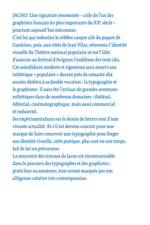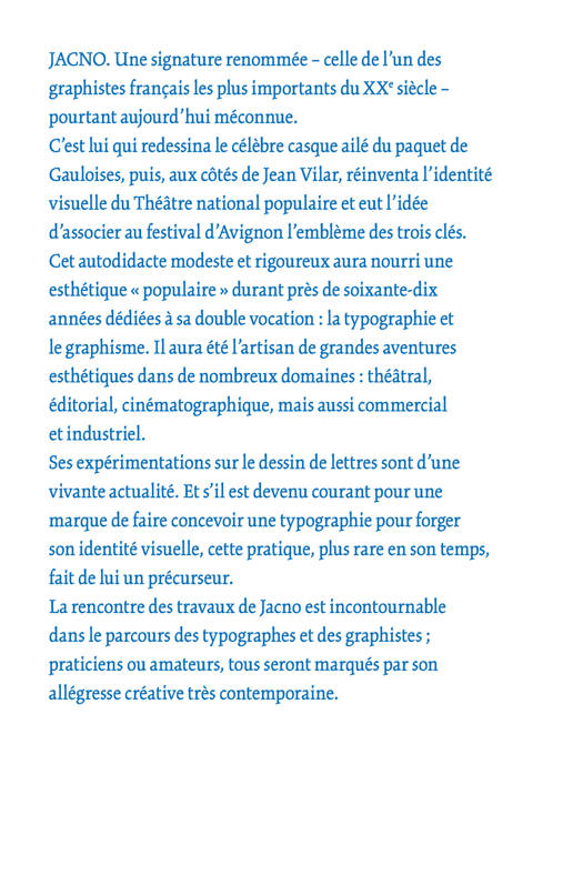JACNO. Une signature renommée - celle de l'un des graphistes français les plus importants du XXe siècle - pourtant aujourd'hui méconnue. C'est lui qui redessina le célèbre casque ailé du paquet de Gauloises, puis, aux côtés de Jean Vilar, réinventa l'identité visuelle du Théâtre national populaire et eut l'idée d'associer au festival d'Avignon l'emblème des trois clés. Cet autodidacte modeste et rigoureux aura nourri une esthétique « populaire » durant près de soixante-dix années dédiées à sa double vocation : la typographie et le graphisme. Il aura été l'artisan de grandes aventures esthétiques dans de nombreux domaines : théâtral, éditorial, cinématographique, mais aussi commercial et industriel. Ses expérimentations sur le dessin de lettres sont d'une vivante actualité. Et s'il est devenu courant pour une marque de faire concevoir une typographie pour forger son identité visuelle, cette pratique, plus rare en son temps, fait de lui un précurseur. La rencontre des travaux de Jacno est incontournable dans le parcours des typographes et des graphistes ; praticiens ou amateurs, tous seront marqués par son allégresse créative très contemporaine.