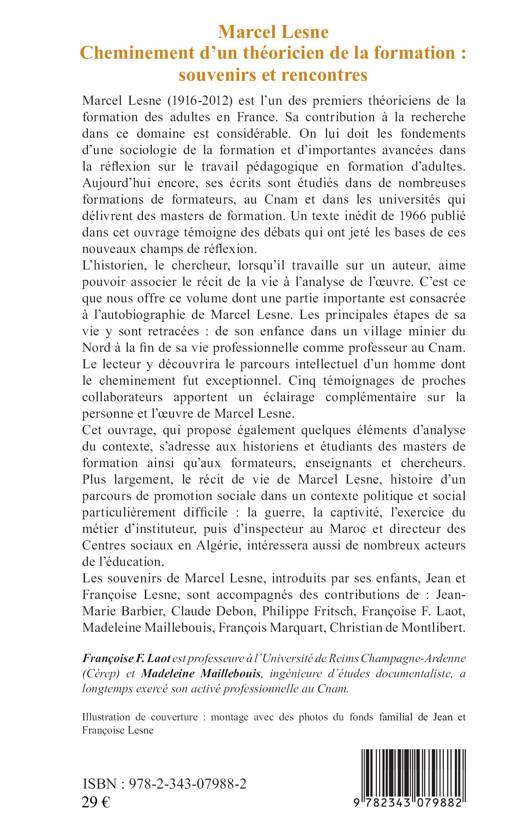 Marcel Lesne (1916-2012) est l'un des premiers théoriciens de la formation des adultes en France. On lui doit les fondements d'une sociologie de la formation et d'importantes avancées dans la réflexion sur le travail pédagogique en formation d'adultes. Cet ouvrage propose d'associer le récit de la vie à l'analyse de l'oeuvre de Marcel Lesne. C'est plus largement l'histoire d'un parcours de promotion sociale dans un contexte politique particulièrement difficile : la guerre, la captivité, l'exercice du métier d'instituteur, d'inspecteur au Maroc et directeur des centres sociaux en Algérie.