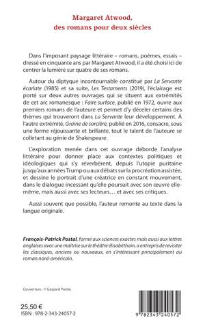 Dans l'imposant paysage littéraire _romans, poèmes, essais _ dressé en cinquante ans par Margaret Atwood, il a été choisi ici de centrer la lumière sur quatre de ses romans. Autour du diptyque incontournable constitué par La Servante écarlate (1985) et sa suite, Les Testaments (2019), l'éclairage est porté sur deux autres ouvrages qui se situent aux extrémités de cet arc romanesque: Faire surface, publié en 1972, ouvre aux premiers romans de l'auteure et permet d'y déceler certains des thèmes qui trouveront dans La Servante leur développement. À l'autre extrémité, Graine de sorcière, publié en 2016, consacre, sous une forme réjouissante et brillante, tout le talent de l'auteure se colletant au génie de Shakespeare. L'exploration menée dans cet ouvrage déborde l'analyse littéraire pour donner place aux contextes politiques et idéologiques qui s'y réverbèrent, depuis l'utopie puritaine jusqu'aux années Trump ou aux débats sur la procréation assistée, et dessine le portrait d'une créatrice en constant mouvement, dans le dialogue incessant qu'elle poursuit avec son oeuvre elle-même, mais aussi avec ses lecteurs... et avec ses critiques. Aussi souvent que possible, l'auteur remonte au texte dans la langue originale.