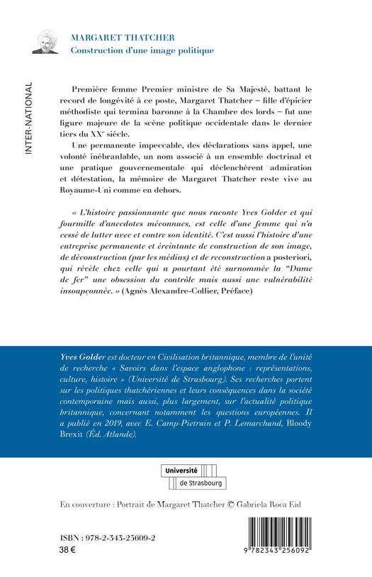 Première femme Premier ministre de Sa Majesté, battant le record de longévité à ce poste, Margaret Thatcher - fille d’épicier méthodiste qui termina baronne à la Chambre des lords - fut une figure majeure de la scène politique occidentale dans le dernier tiers du XXe siècle. Une permanente impeccable, des déclarations sans appel, une volonté inébranlable, un nom associé à un ensemble doctrinal et une pratique gouvernementale qui déclenchèrent admiration et détestation, la mémoire de Margaret Thatcher reste vive au Royaume Uni comme en dehors. « L’histoire passionnante que nous raconte Yves Golder et qui fourmille d’anecdotes méconnues, est celle d’une femme qui n’a cessé de lutter avec et contre son identité. C’est aussi l’histoire d’une entreprise permanente et éreintante de construction de son image, de déconstruction (par les médias) et de reconstruction a posteriori, qui révèle chez celle qui a pourtant été surnommée la Dame de fer une obsession du contrôle mais aussi une vulnérabilité insoupçonnée. » (Agnès Alexandre-Collier, Préface)