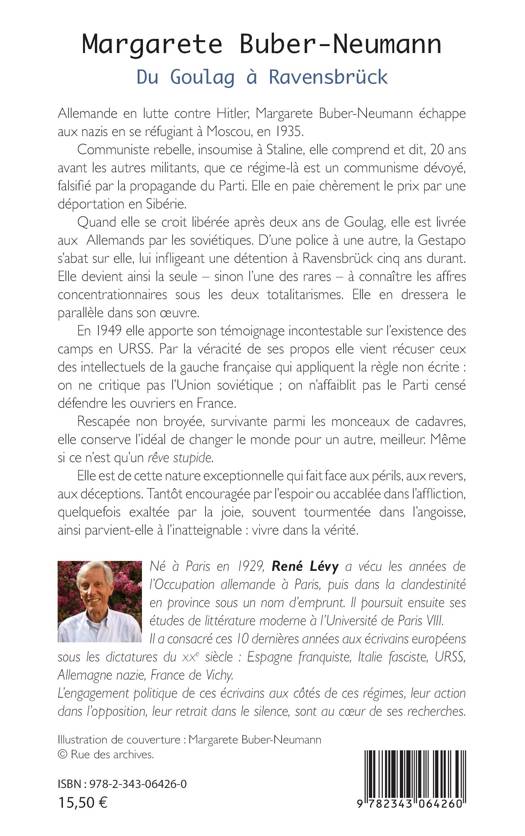 Allemande en lutte contre Hitler, Margarete Buber-Neumann échappe aux nazis en se réfugiant à Moscou, en 1935. Avec cet ouvrage René Levy nous raconte le parcours de cette communiste rebelle, insoumise à Staline qui en paiera le prix par une déportation en Sibérie. Livrée aux Allemands, elle est détenue cinq ans à Ravensbrück. En 1949, elle apporte son témoignage sur l'existence des camps en URSS. Rescapée non broyée, elle est de cette nature exceptionnelle qui fait face aux périls, aux revers pour vivre coûte que coûte dans la vérité.