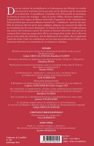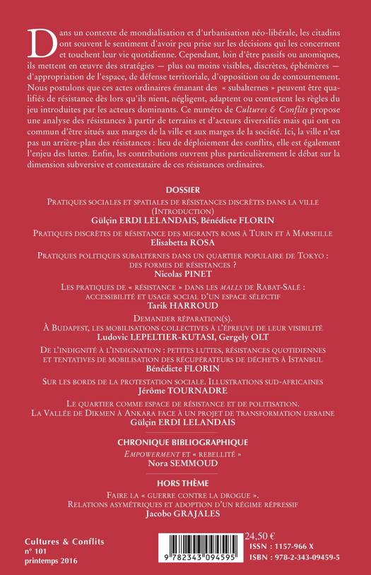 Dans un contexte de mondialisation et d'urbanisation néo-libérale, les citadins ont souvent le sentiment d'avoir peu prise sur les décisions qui les concernent. Cependant, loin d'être passifs ou anomiques, ils mettent en œuvre des stratégies d'appropriation de l'espace, de défense territoriale, d'opposition ou de contournement. Les auteurs de ce numéro de Cultures & Conflits postulent que ces actes ordinaires peuvent être qualifiés de résistance dès lors qu'ils nient, négligent, adaptent ou contestent les règles du jeu introduites par les acteurs dominants.