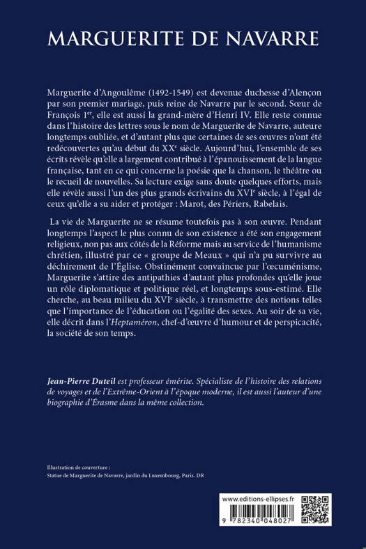 Marguerite d’Angoulême (1492-1549) est devenue duchesse d’Alençon par son premier mariage, puis reine de Navarre par le second. Sœur de François 1er, elle est aussi la grand-mère d’Henri IV. Elle reste connue dans l’histoire des lettres sous le nom de Marguerite de Navarre, auteure longtemps oubliée, et d’autant plus que certaines de ses œuvres n’ont été redécouvertes qu’au début du XXe siècle. Aujourd’hui, l’ensemble de ses écrits révèle qu’elle a largement contribué à l’épanouissement de la langue française, tant en ce qui concerne la poésie que la chanson, le théâtre ou le recueil de nouvelles. Sa lecture exige sans doute quelques efforts, mais elle révèle aussi l’un des plus grands écrivains du XVIe siècle, à l’égal de ceux qu’elle a su aider et protéger : Marot, des Périers, Rabelais.