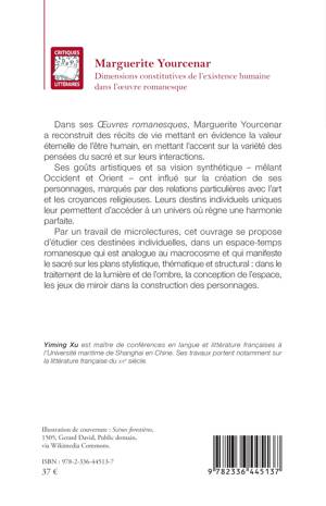 Dans ses OEuvres romanesques, Marguerite Yourcenar a reconstruit des récits de vie mettant en évidence la valeur éternelle de l'être humain, en mettant l'accent sur la variété des pensées du sacré et sur leurs interactions. Ses goûts artistiques et sa vision synthétique - mêlant Occident et Orient - ont influé sur la création de ses personnages, marqués par des relations particulières avec l'art et les croyances religieuses. Leurs destins individuels uniques leur permettent d'accéder à un univers où règne une harmonie parfaite. Par un travail de microlectures, cet ouvrage se propose d'étudier ces destinées individuelles, dans un espace-temps romanesque qui est analogue au macrocosme et qui manifeste le sacré sur les plans stylistique, thématique et structural dans le traitement de la lumière et de l'ombre, la conception de l'espace, les jeux de miroir dans la construction des personnages.