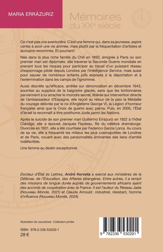 Ce n'est pas une aventurière. C'est une femme qui, dans sa jeunesse, aspire certes à avoir une vie animée, mais plutôt par la fréquentation d'artistes et écrivains renommés. Et pourtant ! Née dans la plus riche famille du Chili en 1892, émigrée à Paris où son premier mari est diplomate, elle traverse la Seconde Guerre mondiale en prenant tous les risques pour participer au travail d'un puissant réseau d'espionnage piloté depuis Londres par l'Intelligence Service, mais aussi pour sauver de nombreux enfants juifs exposés à la déportation et à l'extermination dans les camps de l'ignominie. Aussi discrète qu'efficace, arrêtée sur dénonciation en décembre 1943, soumise au supplice de la baignoire glacée, sans que les tortionnaires parviennent à lui arracher le moindre secret, libérée sur intervention directe de l'ambassadeur d'Espagne, elle reçoit au retour de la paix la Médaille du courage délivrée par le roi d'Angleterre George VI, la Légion d'honneur française ainsi que la Croix de guerre avec palme. Puis, en 2005, l'État d'Israël la reconnaît à titre posthume Juste parmi les Nations. Après le suicide de son premier mari Guillermo Errázuriz en 1922 à l'hôtel Claridge, elle a épousé Jacques Feydeau, fils du célèbre dramaturge. Divorcée en 1931, elle a été courtisée par Federico Garcia Lorca. Au cours de sa vie, elle a fréquenté les milieux les plus cosmopolites de Londres et de Paris, nouant avec des personnalités éminentes des liens d'amitié indéfectible. Une femme au destin exceptionnel.