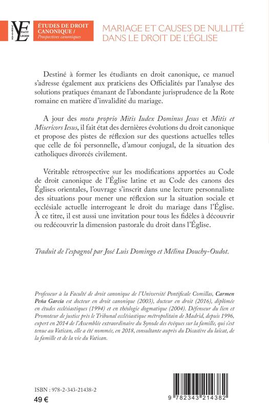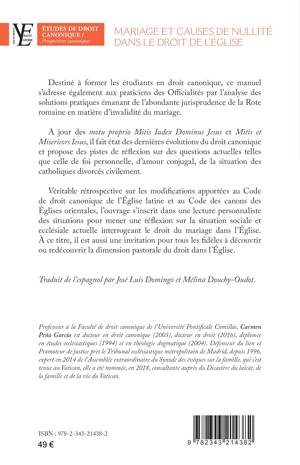 Destiné à former les étudiants en droit canonique, ce manuel s’adresse également aux praticiens des Officialités par l’analyse des solutions pratiques émanant de l’abondante jurisprudence de la Rote romaine en matière d’invalidité du mariage. A jour des motu proprio Mitis Iudex Dominus Jesus et Mitis et Misericors Iesus, il fait état des dernières évolutions du droit canonique et propose des pistes de réflexion sur des questions actuelles telles la foi personnelle, l’amour conjugal, ou la situation des catholiques divorcés civilement. Véritable rétrospective sur les modifications apportées au Code de droit canonique de l’Église latine et au Code des canons des Églises orientales, l’ouvrage s’inscrit dans une lecture personnaliste des situations pour mener une réflexion sur la situation sociale et ecclésiale actuelle interrogeant le droit du mariage dans l’Église. Traduit de l’espagnol par José Luis Domingo et Mélina Douchy-Oudot.