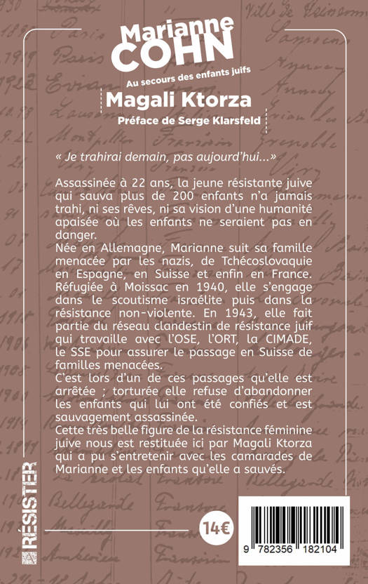 « Je trahirai demain, pas aujourd’hui…. » Assassinée à 22 ans, la jeune résistante juive qui sauva plus de 200 enfants n’a jamais trahi, ni ses rêves, ni sa vision d’une humanité apaisée où les enfants ne seraient pas en danger. Née en Allemagne, Marianne suit sa famille menacée par les nazis, de Tchécoslovaquie en Espagne, en Suisse et enfin en France. Réfugiée à Moissac en 1940, elle s’engage dans le scoutisme israélite puis dans la résistance non-violente. En 1943, elle fait partie du réseau clandestin de résistance juif qui travaille avec l’OSE, l’ORT, la CIMADE, le SSE pour assurer le passage en Suisse de familles menacées. C’est lors d’un de ces passages qu’elle est arrêtée ; torturée elle refuse d’abandonner les enfants qui lui ont été confiés et est sauvagement assassinée. Cette très belle figure de la résistance féminine juive nous est restituée ici par Magali Ktorza qui a pu s’entretenir avec les camarades de Marianne et les enfants qu’elle a sauvés.