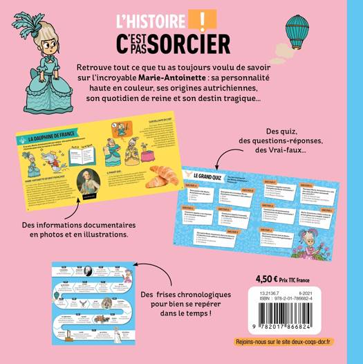 Une nouvelle collection de documentaire avec la marque C'est pas sorcier dans un format souple et pratique. Un mix d'informations, de quiz, de chiffres clés, d'activités, de photos et d'illustrations sur la reine Marie-Antoinette: sa personnalité, ses origines, la révolution française... Tout pour connaître en quelques pages les événements-clés, rencontres, époque de ce personnage. Avec une frise chronologique pour aider l'enfant à se repérer dans le temps.