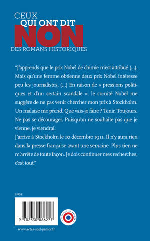 La vie et les combats de la grande scientifique française Marie Curie, deux fois prix Nobel. Venue de Pologne à la fin du XIXe siècle pour étudier en France, elle lutta avec âpreté pour se faire une place dans le milieu scientifique et fut récompensée pour ses travaux sur la radioactivité. Malgré les cabales et le dénigrement constant des milieux traditionnels, elle a mené sa vie de chercheuse et de femme en toute indépendance et avec passion. Dans ce roman écrit à la première personne, on suit son parcours depuis la Pologne occupée par la Russie jusqu'à sa mort en 1934.