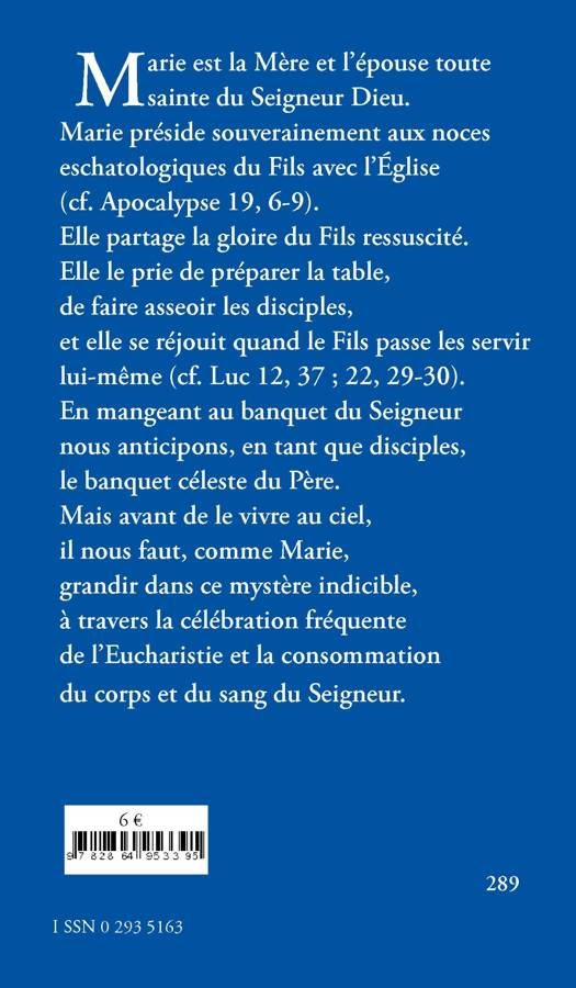 Marie est la Mère et l'épouse toute sainte du Seigneur Dieu. Marie préside souverainement aux noces eschatologiques du Fils avec l'Eglise. Elle partage la gloire du Fils ressuscité. Elle le prie de préparer la table, de faire assoir les disciples, et elle se réjouit quand le Fils passe les servir lui-même. En mangeant au banquet du Seigneur nous anticipons, en tant que disciples, le banquet celeste du père. Mais avant de le vivre au Ciel, il nous faut , comme Marie, grandir dans ce mystère indicible, à travers la célébration fréquente de l'eucharistie et la consommation du corps et du sang du Seigneur.