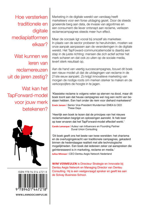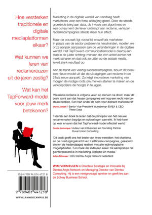 Hoe versterken traditionele en digitale mediaplatformen elkaar? Wat kunnen we leren van reclamereuzen uit de jaren zestig? Wat kan het TapForward-model voor jouw merk betekenen? Marketing in de digitale wereld van vandaag heeft marketeers voor een forse uitdaging gezet. Door de steeds groeiende berg aan data, de invasie van algoritmes en een consument die liever ontsnapt aan reclame, verliezen reclamecampagnes steeds meer hun effect. Maar de oorzaak ligt vooral bij onszelf als marketeer. In plaats van de sector proberen te heruitvinden, moeten we onze aanpak aanpassen aan de veranderingen in de digitale wereld. Het TapForward-communicatiemodel is daarbij een stap in de juiste richting: mensen die zich actief achter het merk scharen en dat ook zo uiten op de sociale media, levert sterk resultaat op. Aan de hand van veertig succescampagnes, bouwt dit boek een nieuw model uit dat de uitdagingen van reclame in de 21ste eeuw aanpakt. Zo krijgt innovatieve marketing van morgen de nodige roots om merken sterker te maken en de verkoopcijfers de hoogte in te jagen.