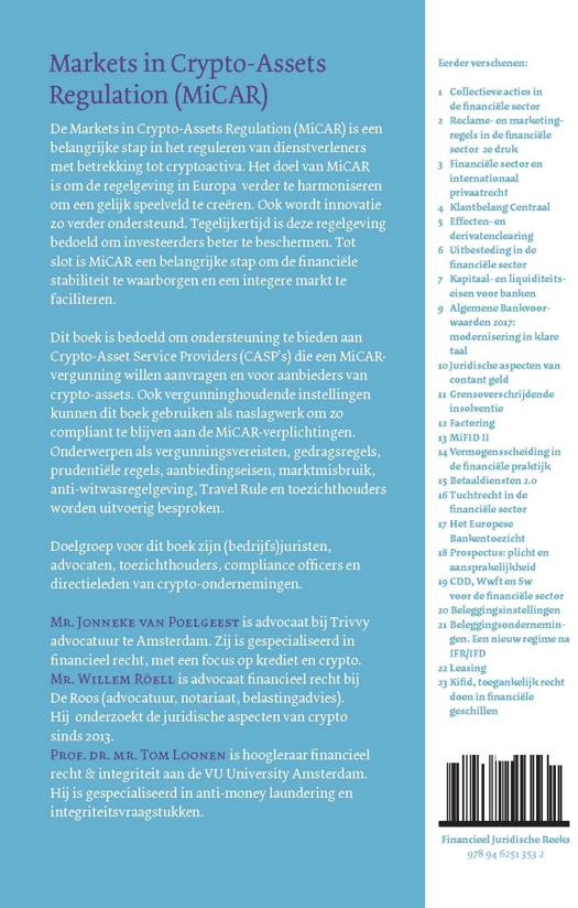 Dit boek is bedoeld om ondersteuning te bieden aan Crypto-Asset Service Providers (CASP’s) die een MiCAR-vergunning willen aanvragen en voor aanbieders van crypto-assets. Ook vergunninghoudende instellingen kunnen dit boek gebruiken als naslagwerk om zo compliant te blijven aan de MiCAR-verplichtingen. Onderwerpen als vergunningsvereisten, gedragsregels, prudentiële regels, aanbiedingseisen, marktmisbruik, anti-witwasregelgeving, Travel Rule en toezichthouders worden uitvoerig besproken