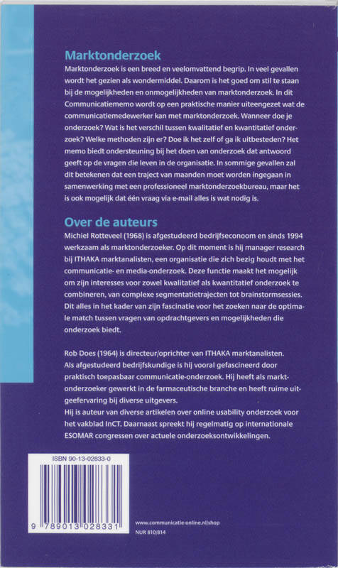 Marktonderzoek is een breed en veelomvattend begrip. In veel gevallen wordt het gezien als wondermiddel. Daarom is het goed om stil te staan bij de mogelijkheden en onmogelijkheden van marktonderzoek. In dit Communicatiememo wordt op een praktische manier uiteengezet wat de communicatiemedewerker kan met marktonderzoek. Wanneer doe je onderzoek? Wat is het verschil tussen kwalitatief en kwantitatief onderzoek? Welke methoden zijn er? Doe ik het zelf of ga ik uitbesteden? Het memo biedt ondersteuning bij het doen van onderzoek dat antwoord geeft op de vragen die leven in de organisatie. In sommige gevallen zal dit betekenen dat een traject van maanden moet worden ingegaan in samenwerking met een professioneel marktonderzoekbureau, maar het is ook mogelijk dat n vraag via e-mail alles is wat nodig is.