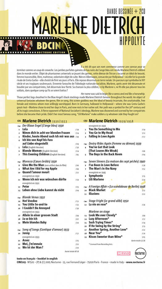 Une biographie de Marlene Dietrich, écrite par Jean William Thoury, illustrée par Hippolyte, accompagnée de 2 compact discs. <br /> Il a été dit que son nom commence comme une caresse pour se terminer comme un coup de cravache. Les jambes parfaites gainées de bas noirs de L’Ange bleu ont rendu Marlene Dietrich célèbre dans le monde entier. Objet de phantasmes universels se jouant des genres, cette déesse de l’écran a incarné un idéal de beauté, femme inaccessible, libre, maîtresse, volontaire objet de culte. Née en Allemagne, consacrée par Hollywood – où elle fut la grande rivale de Greta Garbo – elle choisit de finir ses jours à Paris. Elle repose désormais en terre natale. Un parcours qui symbolise le XXe siècle et ses tragiques soubresauts. Ennemie farouche de l’idéologie nationale-socialiste, Marlene, après avoir été désavouée et boudée par ses compatriotes, fait désormais leur fierté. Sa chanson la plus célèbre, « Lily Marlene », ne fit-elle pas pleurer tous les soldats, dans quelque camp qu’ils se soient battus ?