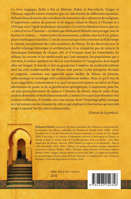 Cet ouvrage est consacré aux villes de Fès, Meknès, Rabat, Marrakech, Tanger et Tétouan. Hauts lieux de savoir et de rencontres, importants centres de pouvoir et de négoce, ces cités anciennes constituent de véritables joyaux. En les décrivant avec le double éclairage historique et architectural, l'auteur retrace leur dynamique, convoquant les événements, les sultans, les savants, les intellectuels et les populations qui y ont vécu. Il met au grand jour l'ampleur du multiculturalisme dont les cités traditionnelles du Maroc sont pétries. Cette entreprise féconde et originale constitue une approche quasi inédite du Maroc où histoire, anthropologie et sociologie sont continuellement mêlées (illustrations couleur).