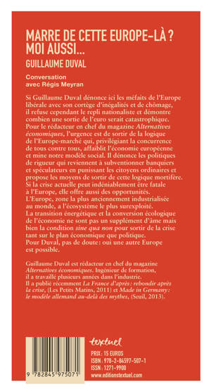 Guillaume Duval, rédacteur en chef du magazine «Alternatives économiques», dénonce les méfaits de l'Europe libérale avec son cortège d'inégalités et de chômage. Il refuse cependant le repli nationaliste et démontre combien les conséquences en seraient catastrophiques pour notre pays. Il explore ici la piste d'une Europe plus solidaire, engagée dans la transition écologique et propose les moyens d'y parvenir. Guillaume Duval nous convainc qu'une autre Europe est possible!