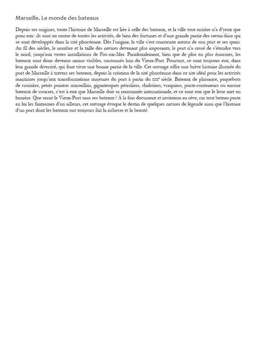 Depuis ses origines, toute l’histoire de Marseille est liée à celle des bateaux, et la ville tout entière n’a d’yeux que pour eux : ils sont au centre de toutes les activités, de bien des fortunes et d’une grande partie des savoir-faire qui se sont développés dans la cité phocéenne. Dès l’origine, la ville s’est construite autour de son port et ses quais. Au fil des siècles, le nombre et la taille des navires devenant plus imposants, le port n’a cessé de s’étendre vers le nord, jusqu’aux vastes installations de Fos-sur-Mer. Paradoxalement, bien que de plus en plus énormes, les bateaux sont donc devenus moins visibles, cantonnés loin du Vieux-Port. Pourtant, ce sont toujours eux, dans leur grande diversité, qui font vivre une bonne partie de la ville. Cet ouvrage offre une brève histoire illustrée du port de Marseille à travers ses bateaux, depuis la création de la cité phocéenne dans ce site idéal pour les activités maritimes jusqu’aux transformations majeures du port à partir du xixe siècle. Bateaux de plaisance, paquebots de croisière, petits pointus marseillais, gigantesques pétroliers, chalutiers, vraquiers, porte-conteneurs ou encore bateaux de courses, c’est à eux que Marseille doit sa renommée internationale, et ce sont eux que le livre met en lumière. Que serait le Vieux-Port sans ses bateaux ? À la fois document et invitation au rêve, car tout bateau porte en lui les fantasmes d’un ailleurs, cet ouvrage évoque le destin de quelques navires de légende ainsi que l’histoire d’un port dont les bateaux ont toujours fait la richesse et la beauté.