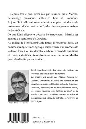 Depuis trente ans, Rémi n’a pas revu sa tante Martha, personnage fantasque, sulfureux, hors du commun. Aujourd’hui, elle est mourante et son père lui demande instamment d’aller mettre de l’ordre dans sa grande maison de Saint-Dizier. Ce que Rémi découvre dépasse l’entendement : Martha est atteinte du syndrome de Diogène. Au milieu de l’invraisemblable fatras, il rencontre Boris, un homme étrange et sans âge, qui semble vivre aux crochets de la dame. Face à cet inextricable enchevêtrement de questions et d’objets stratifiés, Rémi découvre une tout autre Martha que celle décrite par sa famille…
