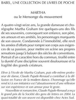 Elève à l'école de Martha Graham, puis elle-même professeur de danse, Claude Pujade-Renaud a contribué à la diffusion en France de la modern dance. L'hommage qu'elle rend ici à son initiatrice est l'aboutissement d'une réflexion sur son expérience et son amour pour le geste. Nouvelliste et romancière, Claude Pujade-Renaud a reçu le grand prix de la Société des gens de lettres en 2004. La quasi-totalité de son oeuvre est disponible chez Actes Sud.