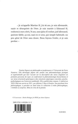 « Je m’appelle Martine H, j’ai 44 ans, je suis allemande, nazie et désespérée de l’être. Je suis mariée à Edmund H, endormi à mes côtés, 74 ans, sans (plus d’) enfant, juif allemand, patriote fidèle, ça oui, nazi en ce sens, par simple habitude, un peu gêné de l’être sans doute. Nous fuyons l’enfer, et je suis perdue. »<br /><br /> Martine H n’est pas une biographie philosophique. Ce n’est pas non plus un livre sur l’identité trans-. L’autrice a voulu dans ce roman, contrairement à L’endroit et Déni ma survie, dont la tonalité est intime et familiale, entrer dans la Grande Histoire et dans celle de philosophes célèbres qui ont fait une part de notre Histoire à toutes et à tous. Mais elle a également voulu montrer leurs replis obsessionnels et traumatiques, et comment leurs idées et leurs concepts se sont incarnés dans leurs entrailles, jusque dans les tréfonds de la transformation identitaire sexuelle de l’un d’eux, sa folle sagesse. Ainsi, Natalie Depraz refuse le roman ou le théâtre d’idées à la façon de Jean-Paul Sartre, pour lui préférer l’incarnation vécue de la pensée dans l’intime fou du corps, en résonance avec la perspective genrée novatrice de Simone de Beauvoir.<br />
