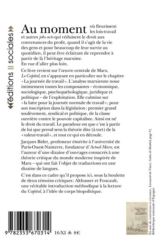 Au moment où fleurissent les lois-travail et autres jobs acts qui réduisent le droit aux convenances du profit, quand il s'agit de la vie des gens et pour beaucoup de leur survie au quotidien, il peut être éclairant de reprendre à partir de là l'héritage marxiste. En vue d'aller plus loin.Ce livre revient sur l'oeuvre centrale de Marx, Le Capital, en s'appuyant en particulier sur le chapitre «La journée de travail». L'analyse marxienne noue intimement toutes les composantes économique, sociologique, psychopathologique, juridique et politique de l'exploitation. Elle culmine sur «la lutte pour la journée normale de travail», pour son inscription dans la législation : premier grand soulèvement, syndical et politique, de la classe ouvrière contre le pouvoir capitaliste. Ainsi est né le droit du travail. Le paradoxe est que c'est à partir de lui que prend sens la théorie dite (à tort) de la «valeur-travail», et tout ce qui en découle.