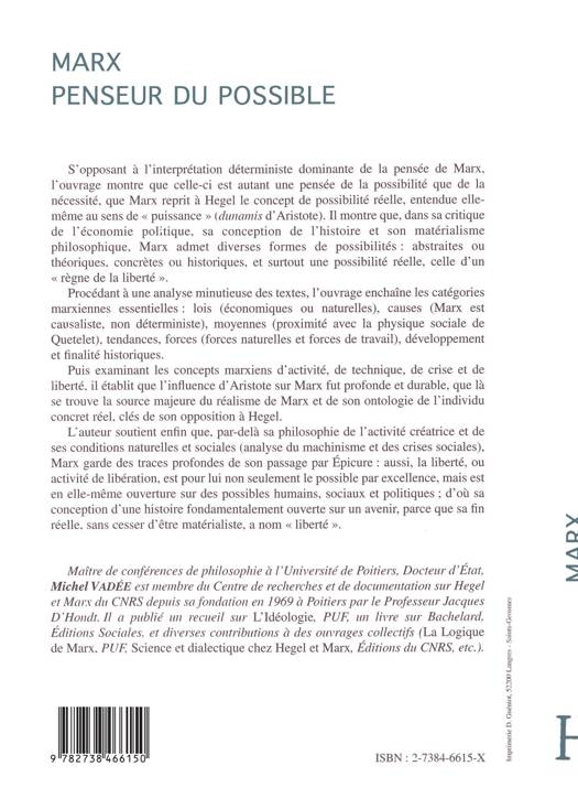 L'auteur montre que Marx admet diverses formes de possibilités : abstraites ou théoriques, concrètes ou historiques, et surtout une possibilité réelle, celle d'un "règne de la liberté". Procédant à une analyse des textes, l'ouvrage enchaîne les catégories marxiennes essentielles : lois, causes, moyennes, tendances, forces, développement et finalité historiques. L'auteur souligne également l'influence d'Aristote et d'Epicure sur le mode marxien de pensée.