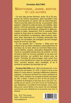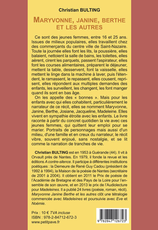 On les appelle des « bonnes ». Mais pour les enfants avec qui elles cohabitent, particulièrement le narrateur de ce récit, elles se nomment Maryvonne, Janine, Berthe, Josiane, Jacqueline, Madeleine. Elles vivent en sympathie étroite avec les enfants. Le livre raconte à partir du concret quotidien la vie avec ces jeunes femmes, qui quittent leur emploi pour se marier. Portraits de personnages mais aussi d'un milieu, d'une famille et en creux du narrateur, le récit vibre, souvent enjoué, sans nostalgie, et se lit comme la narration de tranches de vie.