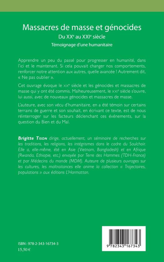 Cet ouvrage évoque le XXe siècle et les génocides et massacres de masse qui y ont été commis. Quelle peut être la signification de telles horreurs ? Y a t-il un sens à leur donner ? Comment les dépasser ? L'auteure, avec son vécu d'humanitaire, en a été témoin sur certains terrains de guerre et son souhait, en écrivant ce texte, est de nous réinterroger sur les facteurs déclenchant ces événements et plus généralement sur la question du Bien et du Mal.